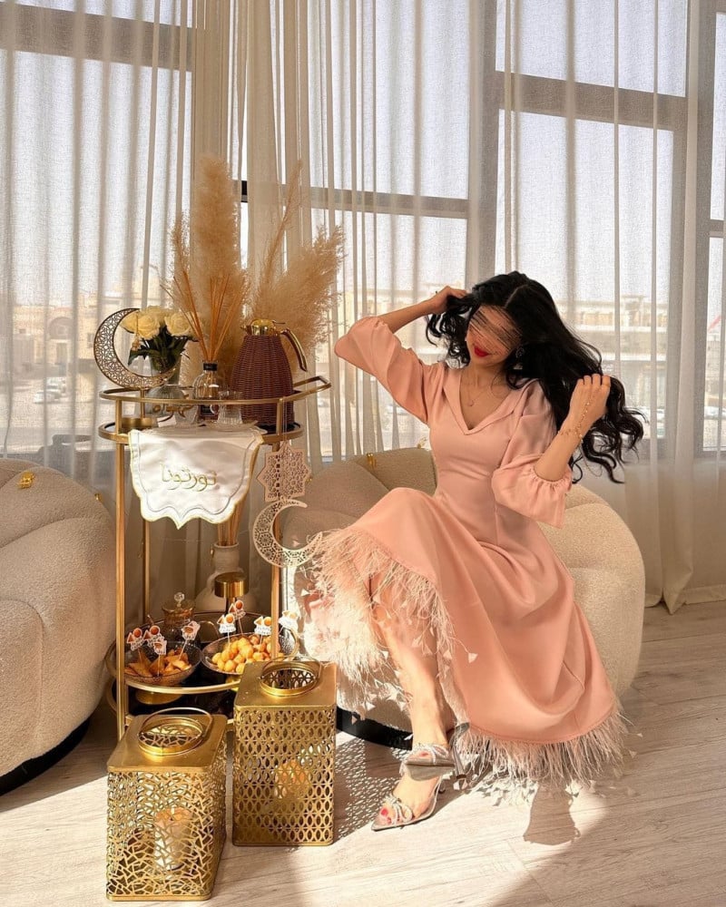 استقبلي العيد بإطلالة ساحرة وأنيقة مع "فستان ميدي تفته وردي بريش النعام"، تحفة فنية تجمع بين الرقة والفخامة لتتألقي في كل لحظة.